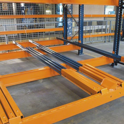 Sistema de almacenaje por acumulación que permite almacenar hasta cuatro tarimas en fondo por cada nivel. Todas las tarimas de un mismo nivel, a excepción de la última, se asientan sobre un conjunto de carros que se desplazan, por empuje, sobre los rieles de rodadura.